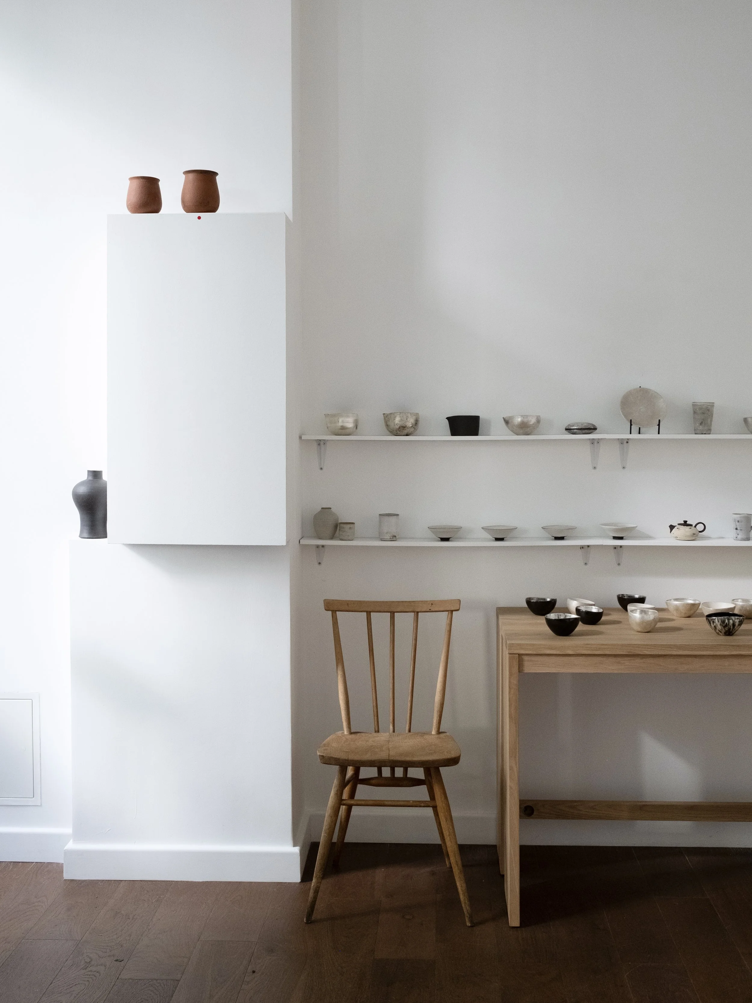 I developed my own Tenmoku glaze — glossy like a mirror, an unfathomable black that breaks into warm brown at the sharp edges of the clay. Its subtle color shifts reveal themselves only when you hold the bowl up and peer past the glare, like catching the last light leaking from a sinking sun.